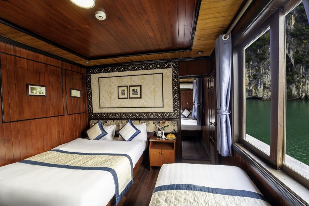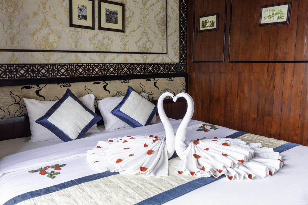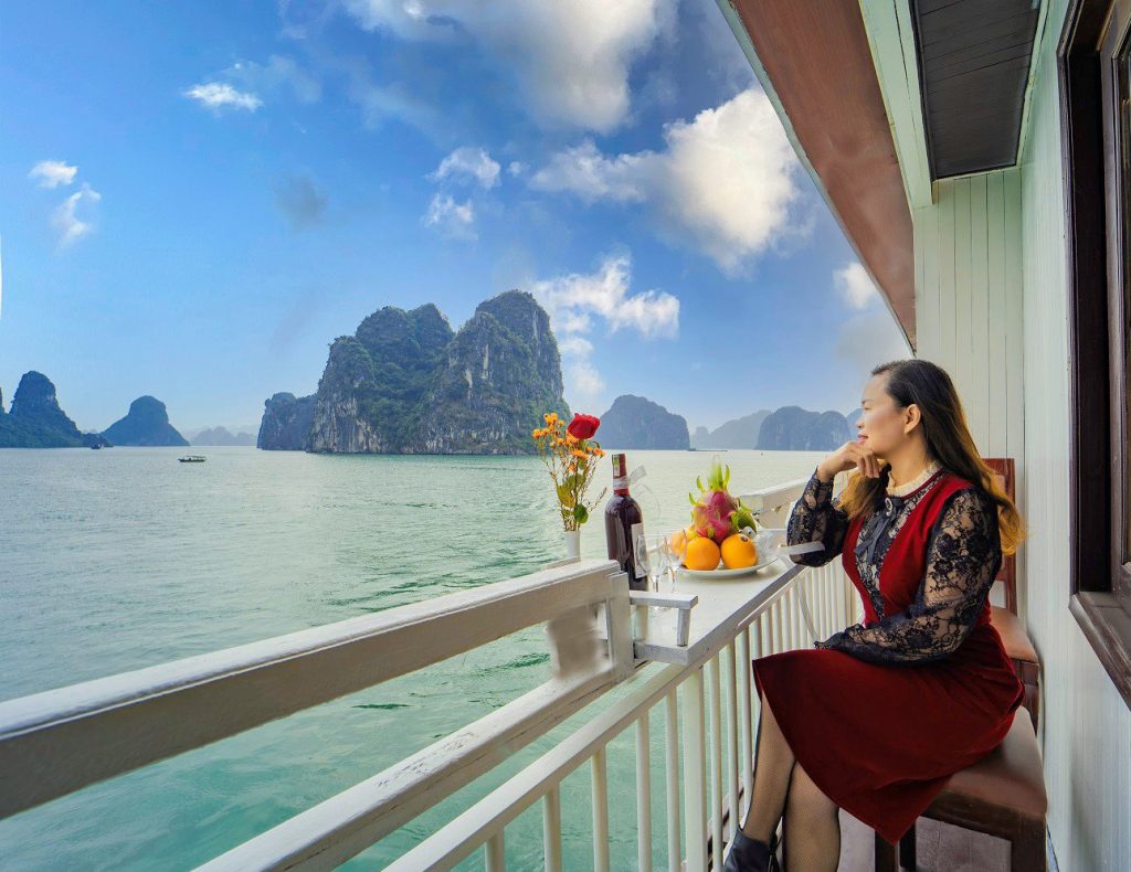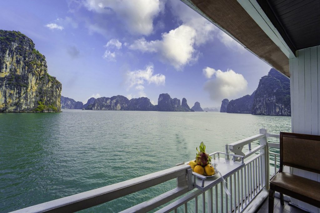 12.00: Arrive Ha Long bay, transfer by tender to the boat, and enjoy welcome drinks. Check in your cabin and enjoy a real Vietnamese lunch while beginning your sail through the fairy land of Ha Long bay, passing by Stone Dog islet, Incense Burner islet, Fighting Cocks, Swan islet, and Duck islet…
